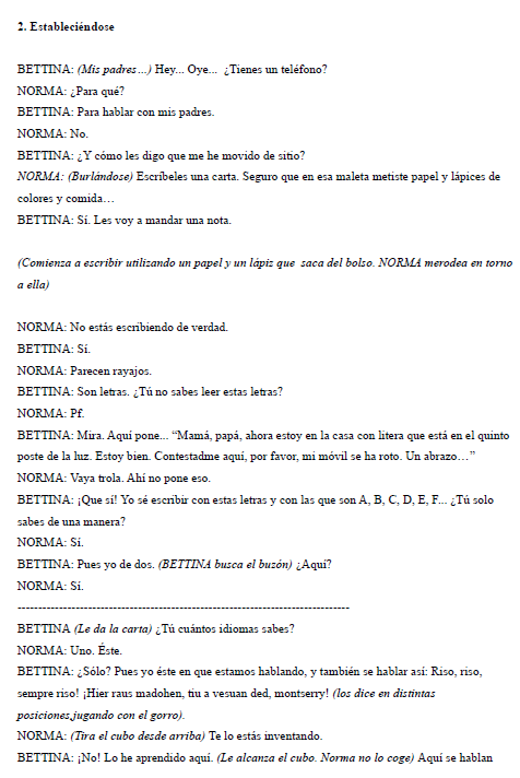 Akotazioak: Testuarekin, elkarrizketarekin batera doazen azalpenak dira. Parentesi artean aurkezten dira eta egileak egiten dituen oharrak izaten dira, obra berak zehazki nahi duen moduan gara dadin. Pertsonaia bat edo leku bat nolakoa den, aktore batek testuaren zati bat nola interpretatu behar duen edota eszenografiaren inguruko iradokizunak izan daitezke.